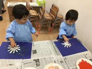 Today Class Sora enjoyed stamping out their fire works, it’s a fun and easy wise to make firework painting for small kids and perfect for celebrate the fire work event.